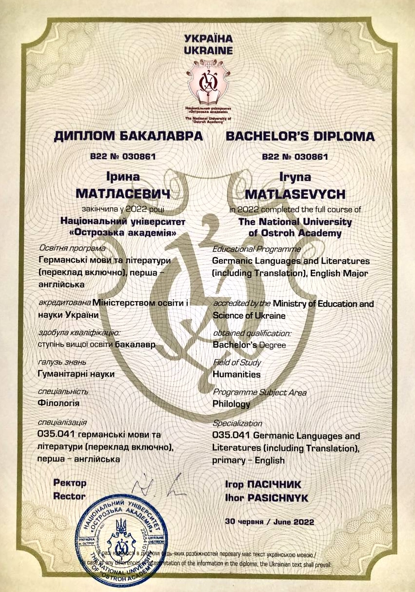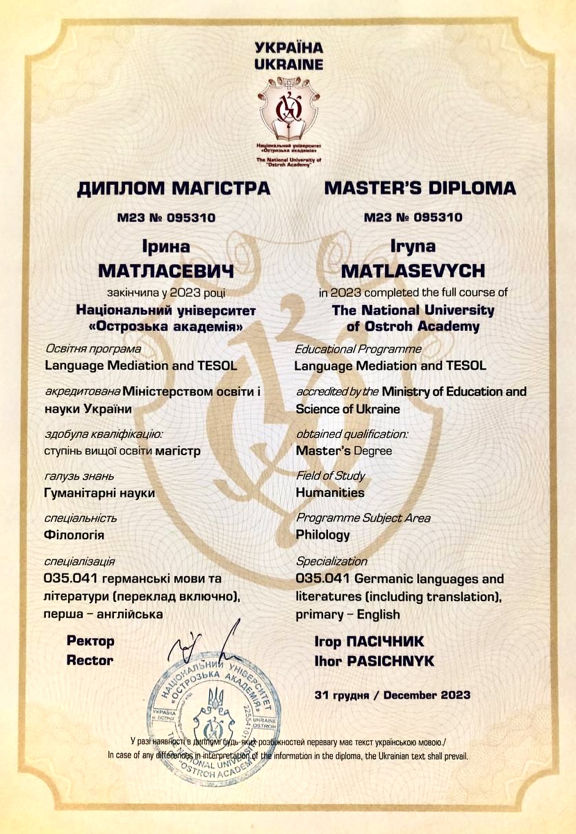 Також маю значний досвід у військовій англійській. У 2022 році склала міжнародний іспит Cambridge CAE (Advanced) в Європі, який підтверджує мій рівень володіння мовою.