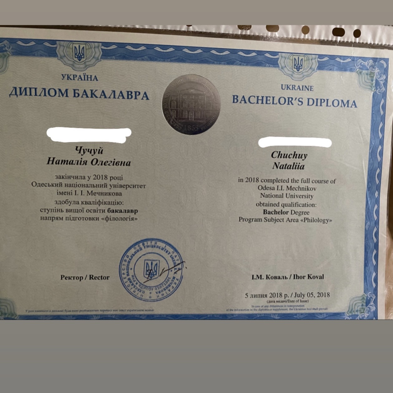 Мені 29 років,я Перекладач англійської мови.Репетитор англійської мови(рівні A1-С1).Навчання та курси іноземних мов за кордоном.Багато мовних курсів та диплом перекладача та філолога. Практика письмових та усних перекладів. Стаж роботи більше 10 років.Працюю як з дорослими,так і дітьми.