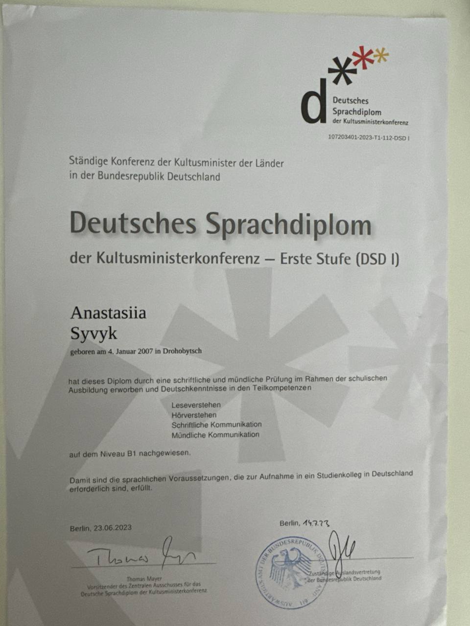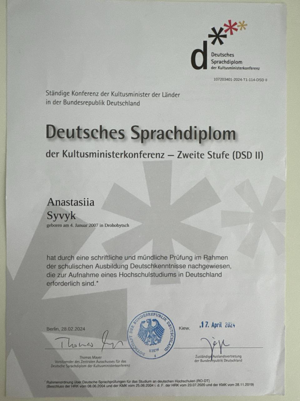 Дрогобицький державний педагогічний університет імені Івана Франка Студентка 1-го курсу | Спеціальність: Німецька мова та зарубіжна література. Національний університет «Львівська політехніка» Студентка 2-го курсу | Спеціальність: 121 Інженерія програмного забезпечення.