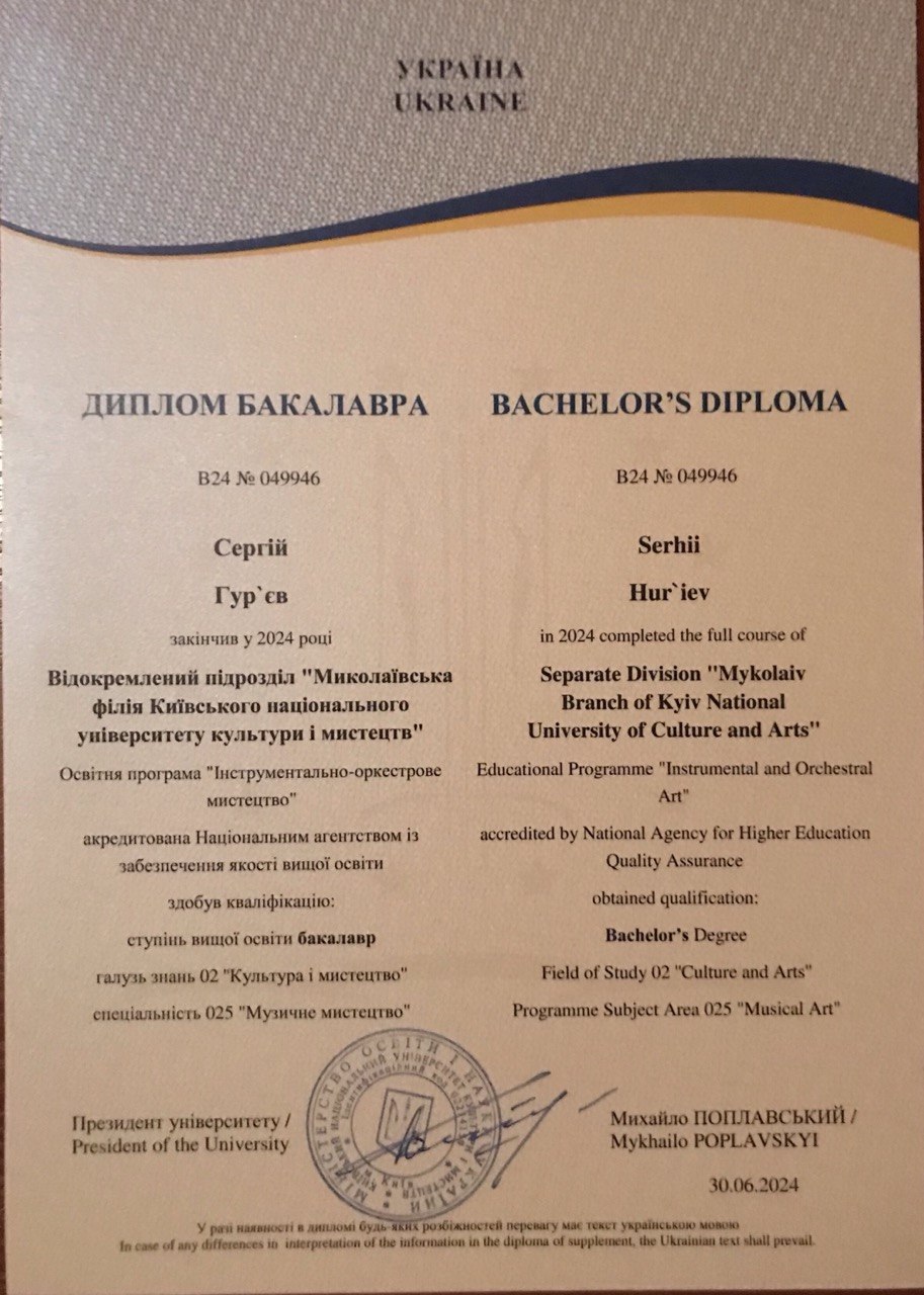 Досвід роботи: 5 років Освіта: магістратура за спеціальністю «Музичне мистецтво» У своїй педагогічній практиці поєдную академічний підхід із сучасними методиками навчання. Працюю як з початківцями, так і з учнями середнього рівня, допомагаючи розвивати техніку, музичне мислення та власний стиль гри.