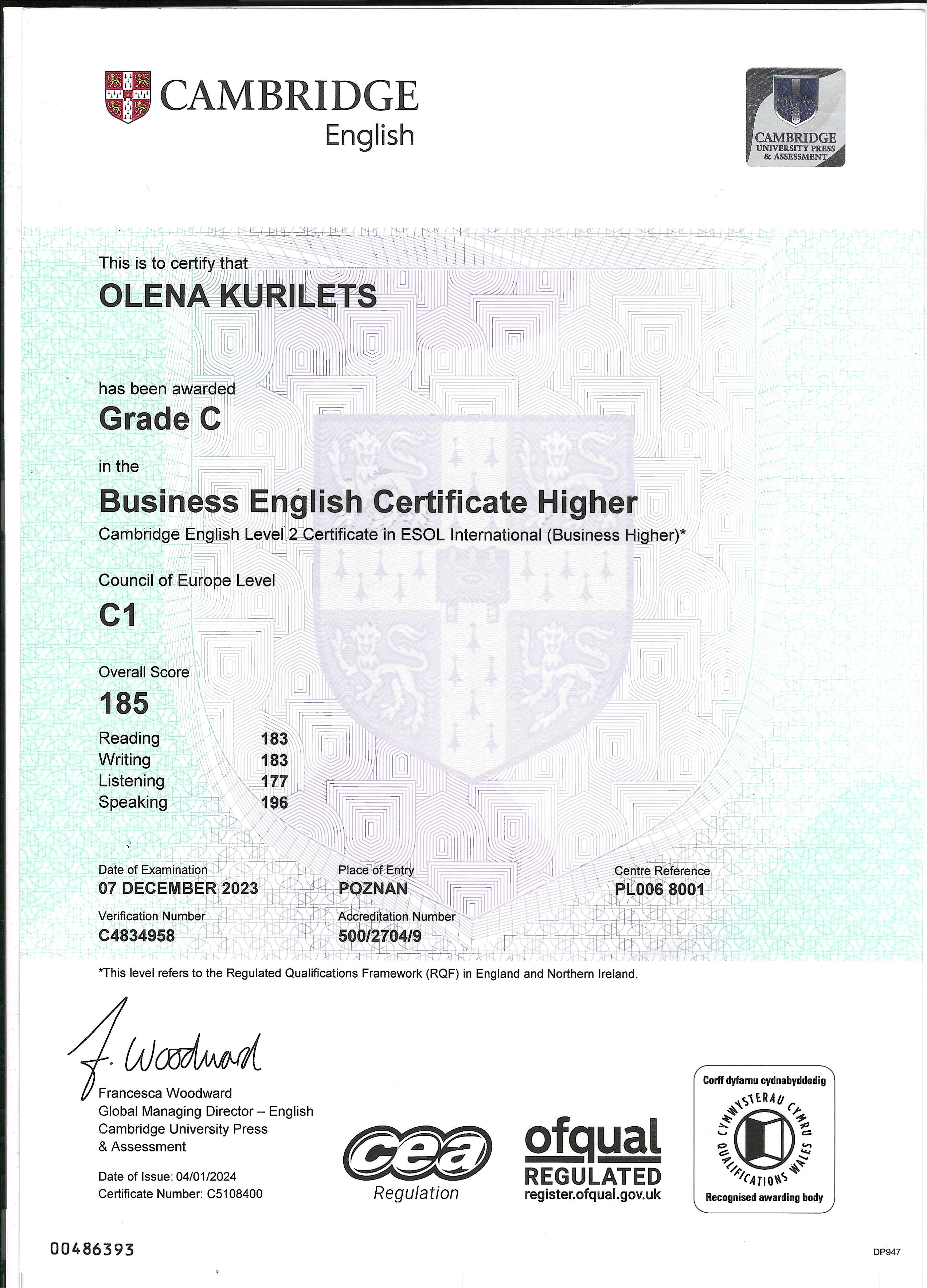 Маю сертифікати - CELTA, IELTS, CAE, FCE, BEC Higher, тому розумію на власному досвіді, чого очікувати і як проходити шлях навчання.