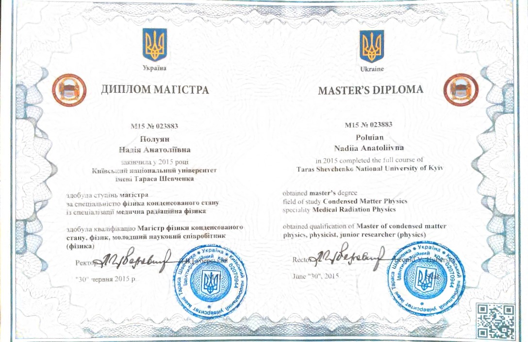 Досвід репетиторства - з 2012 року. Закінчила магістратуру фізичного факультету Київського національного університету імені Тараса Шевченка в 2015 році. Кандидата фізико-математичних наук фізичного факультету КНУ імені Тараса Шевченка в галузі біофізика.