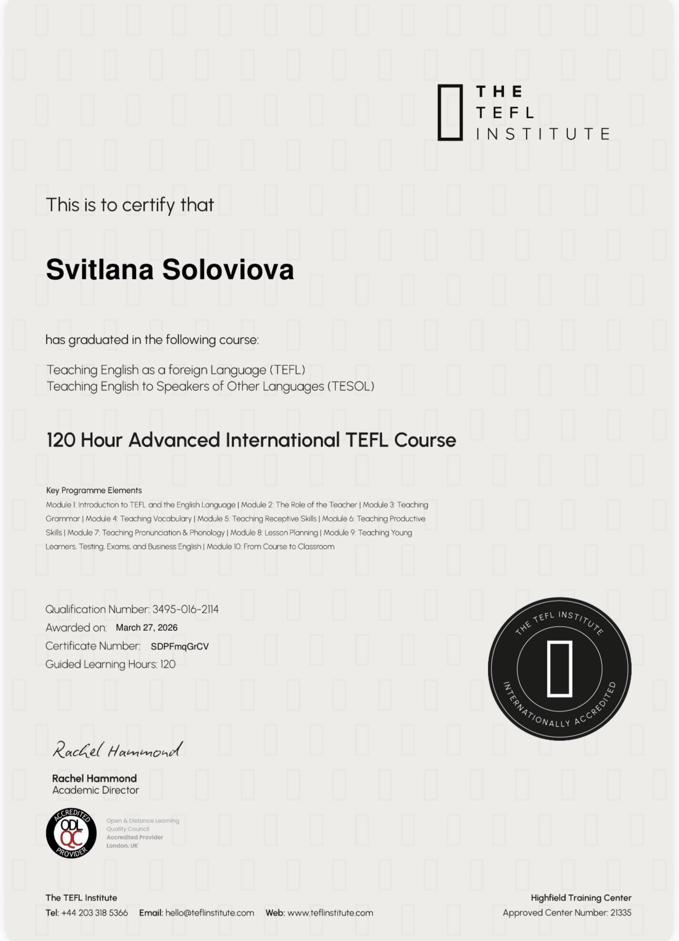 I hold a degree in translation, a certified C1 English level (Cambridge CAE and IELTS), and I regularly upgrade my teaching skills to apply the most up-to-date and effective methods.