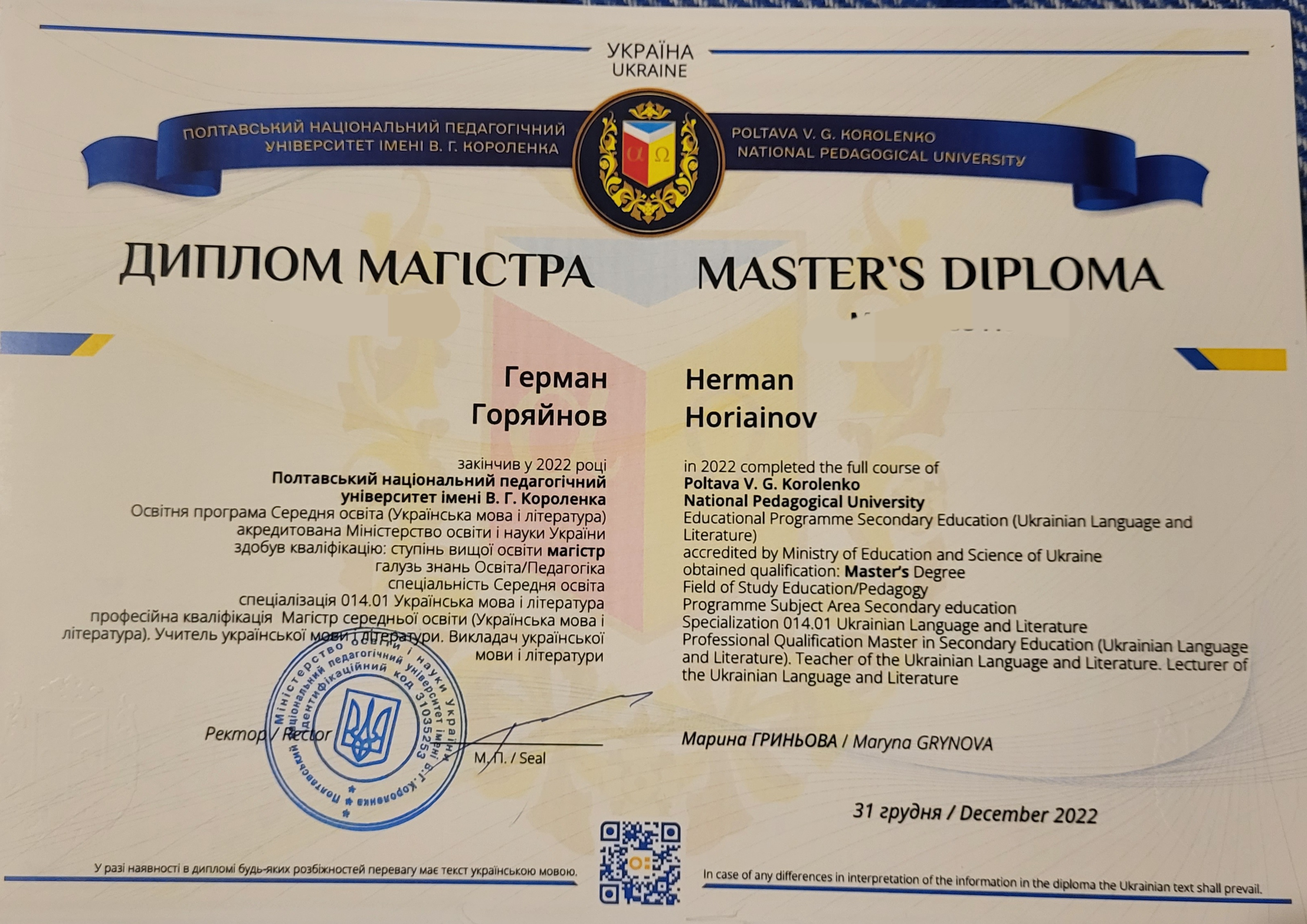 Магістр за спеціальностями Середня освіта (українська мова і література), Середня освіта (Біологія і здоров'я людини) та Середня освіта (англійська мова і зарубіжна література).
