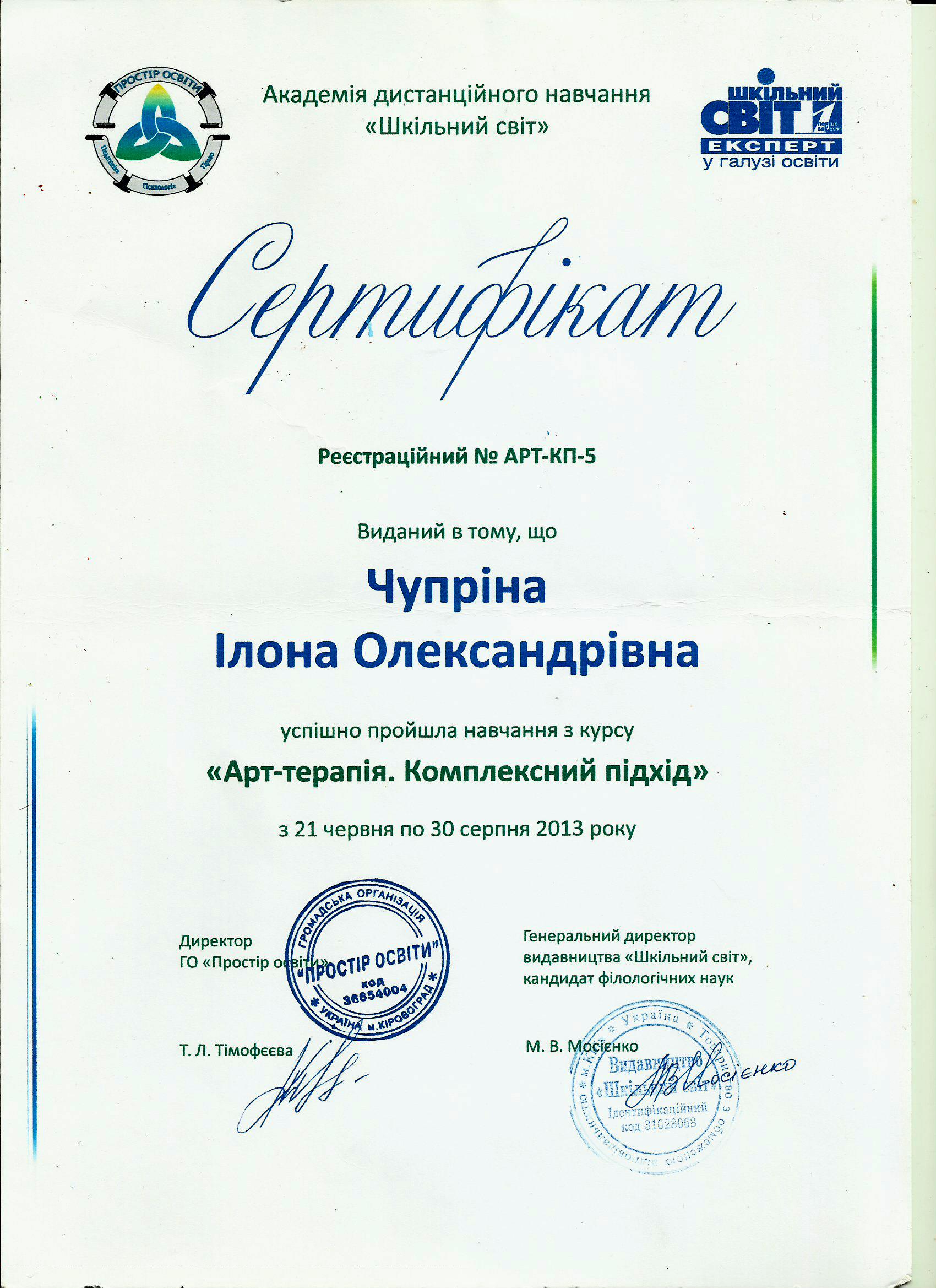 Закінчила художньо-графічний факультет, курси арт-терапії та психології.