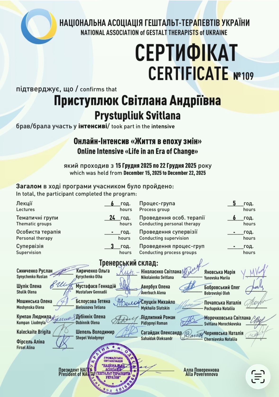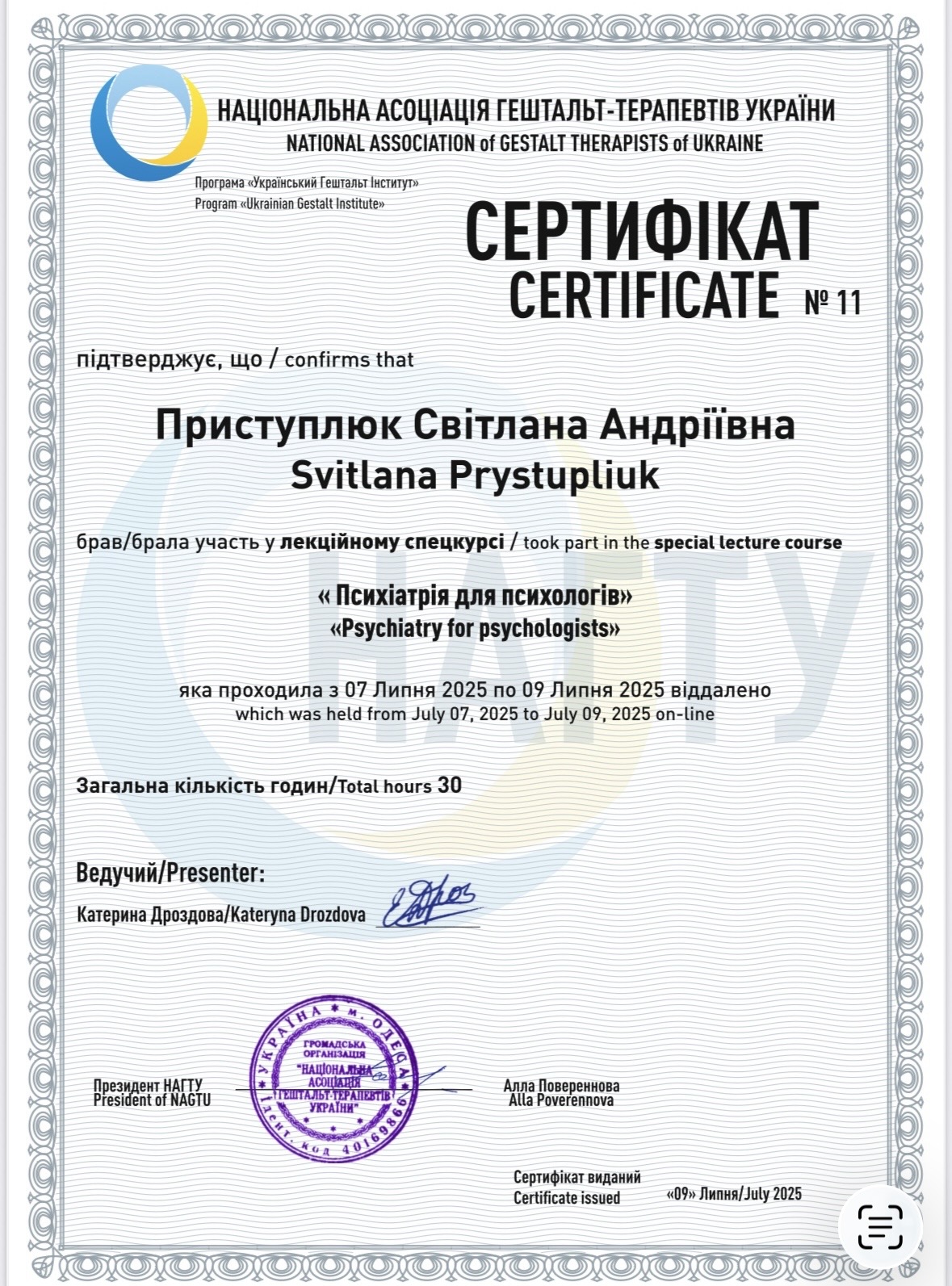 • кандидатка в гештальт-терапевти НАГТУ.