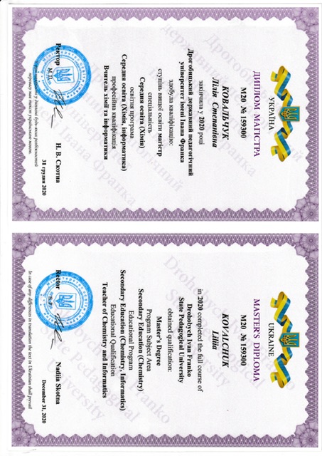 Маю дві вищі освіти. Вчитель хімії та вчитель української мови та літератури. Швидко знаходжу спільну мову з дітьми. Підхід до дітей обираю індивідуально. Маю досвід з інклюзивними дітьми.