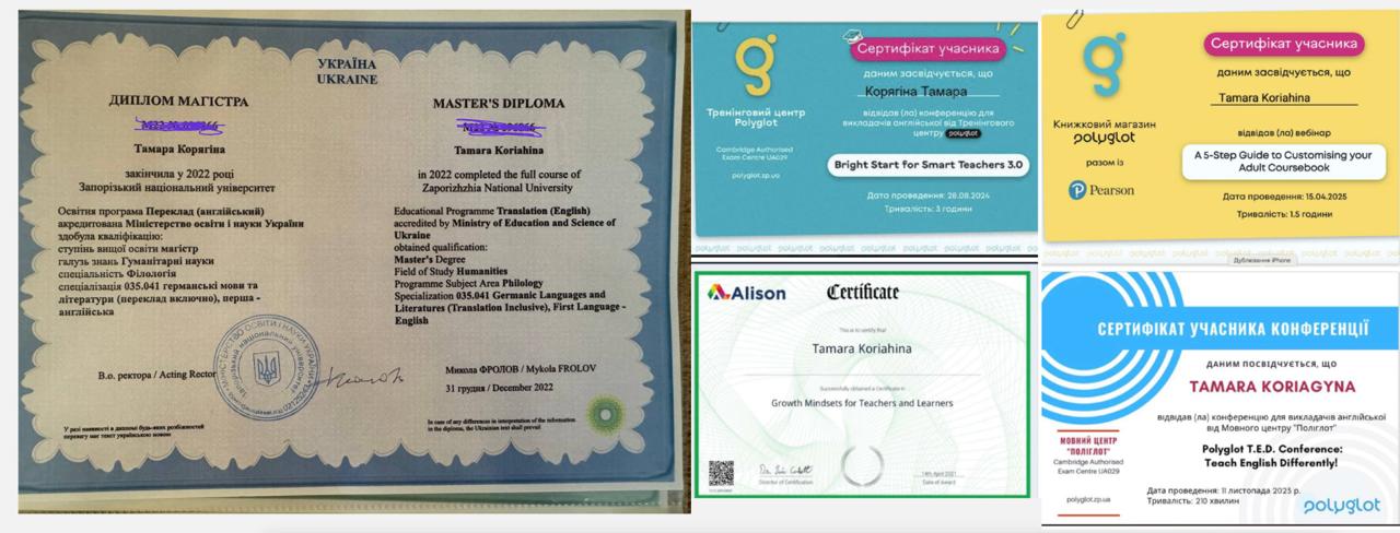 Трішки про себе, маю повну вищу педагогічну освіту ( бакалавр та магістр) в 2022 року закінчила Запорізький національний університет та отримала диплом магістра англійської філології та перекладу.