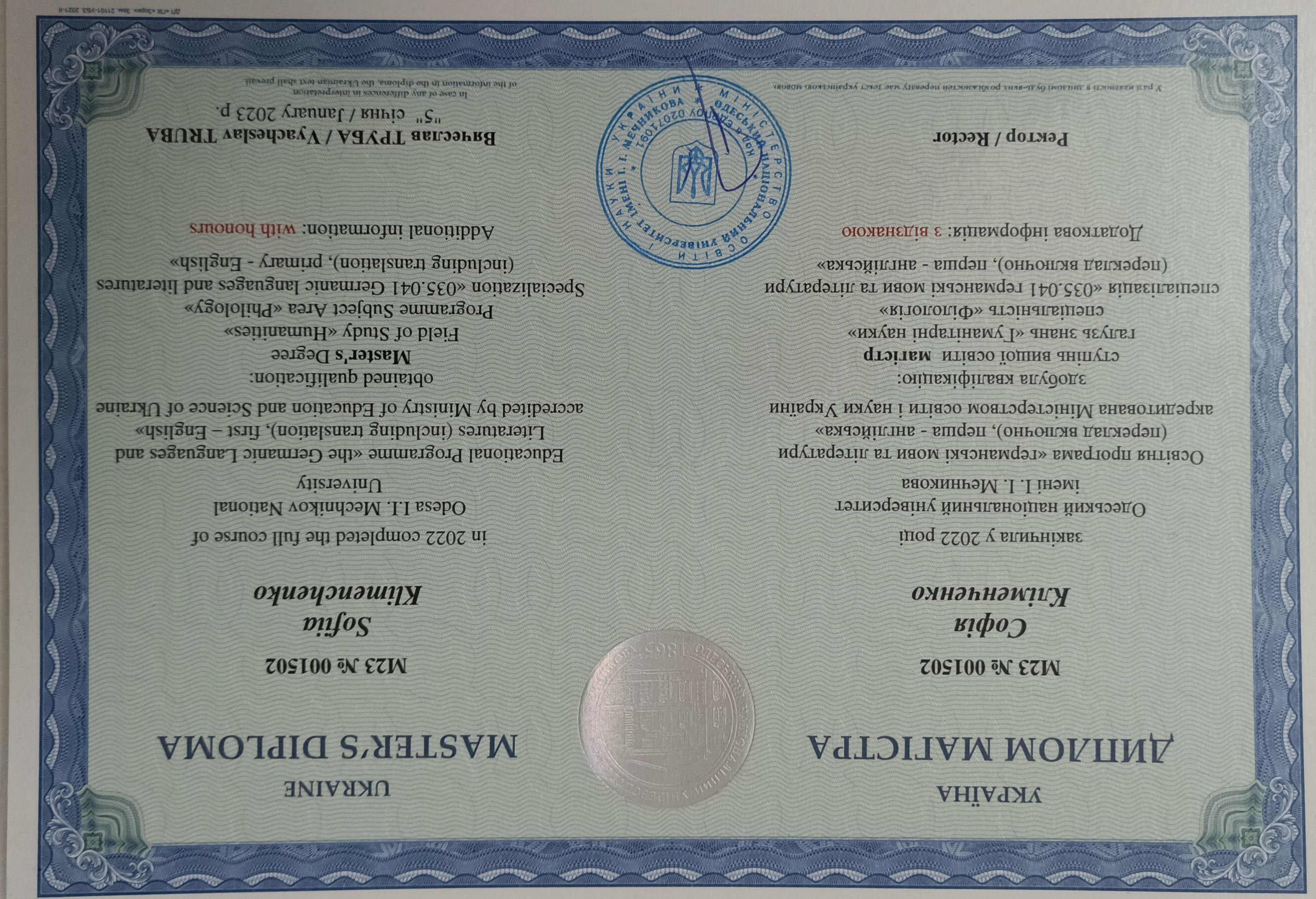 Викладаю англійську мову для діток та для людей із рівнем А1-B2. Проводжу розмовні клуби. Маю диплом магістра з викладання англійської мови. Також працюю перекладачем.