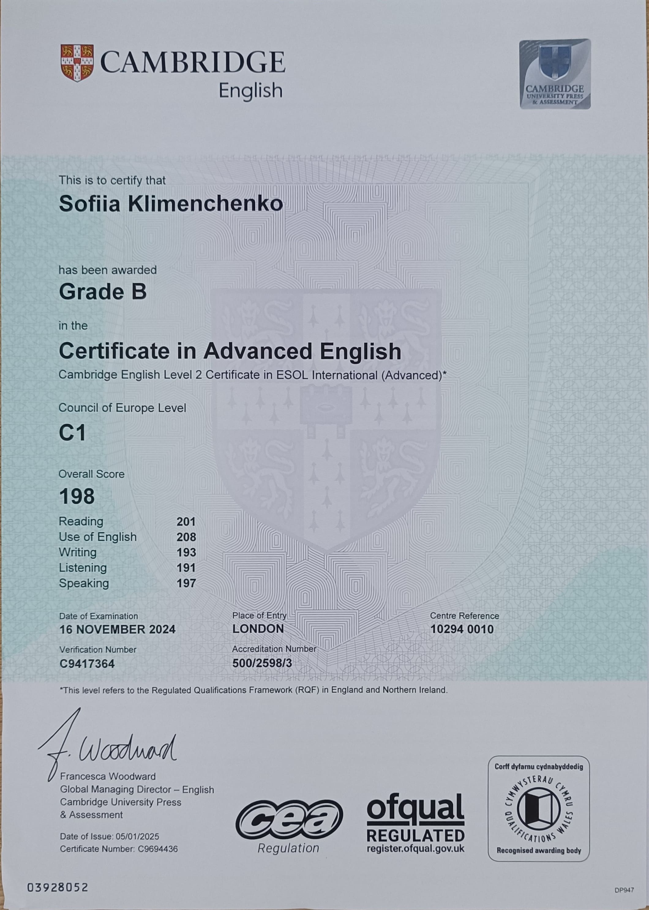 Крім англійської також вивчаю французьку та німецьку мови, тому на собі відчуваю, які методи вивчення іноземної мови працюють, а які ні. Це мені допомагає краще розробляти уроки для своїх учнів та підбирати найефективніші завдання та вправи.