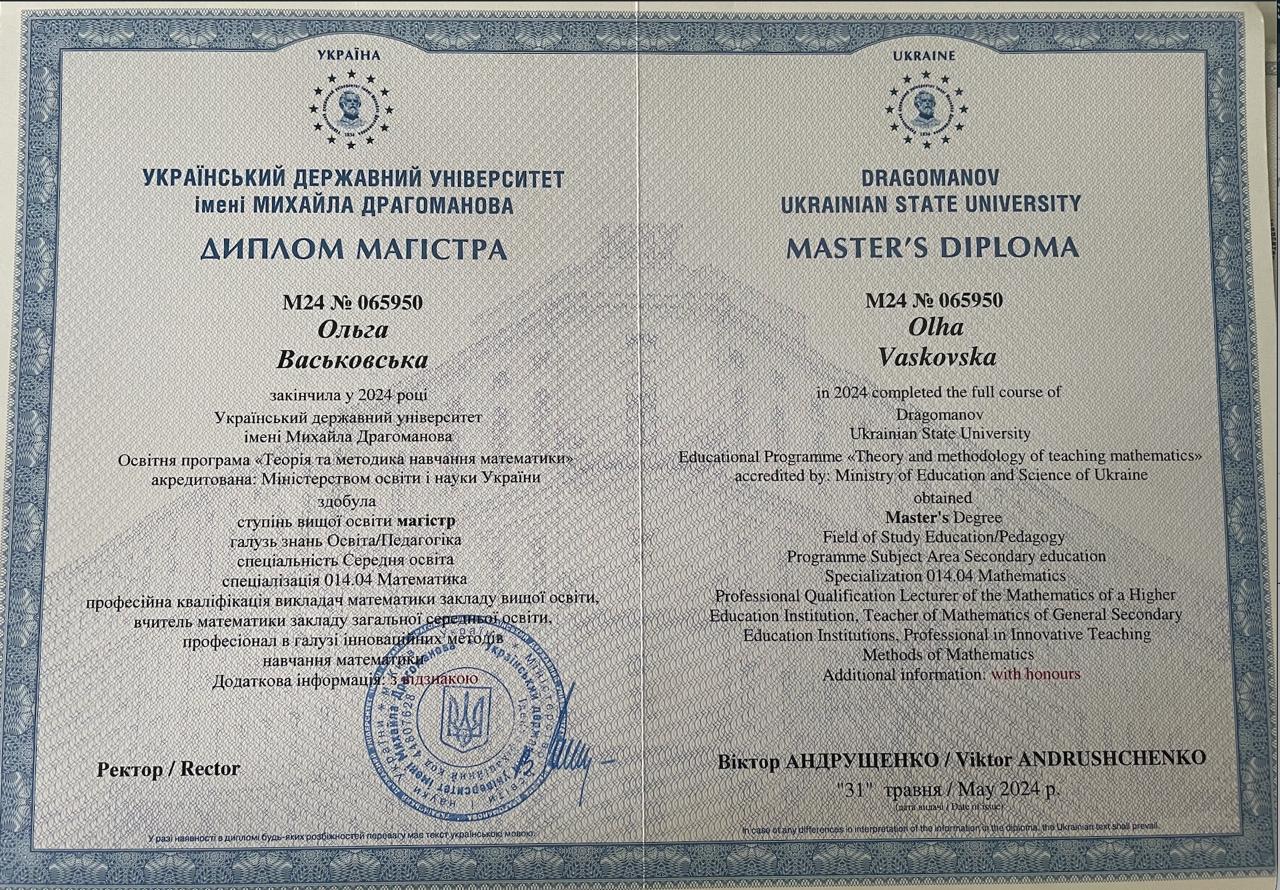 Мене звати Ольга, я — репетитор з математики з 6-річним досвідом роботи. Закінчила школу у 2018 році із золотою медаллю, після чого здобула вищу освіту: бакалаврат за спеціальністю «Математика» та магістратуру за напрямом «Середня освіта (Математика), Теорія та методика навчання математики». Обидва дипломи — з відзнакою.